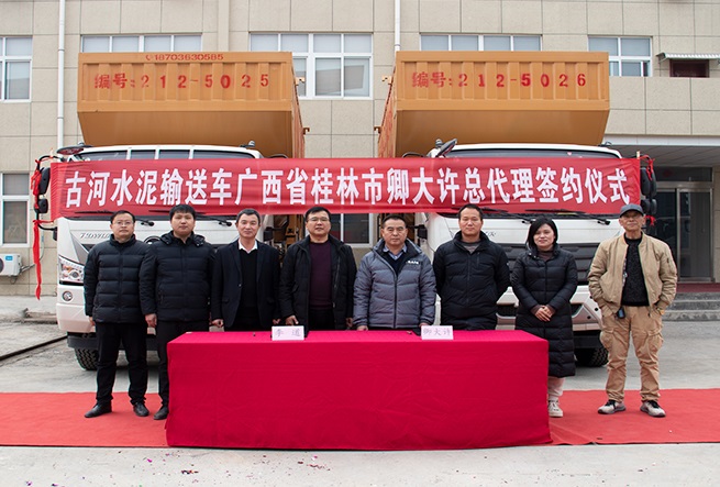 恭賀古河水泥輸送車(chē)廣西桂林總代理卿總簽約成功!首定1臺(tái)車(chē),6臺(tái)水泥輸送機(jī)!
